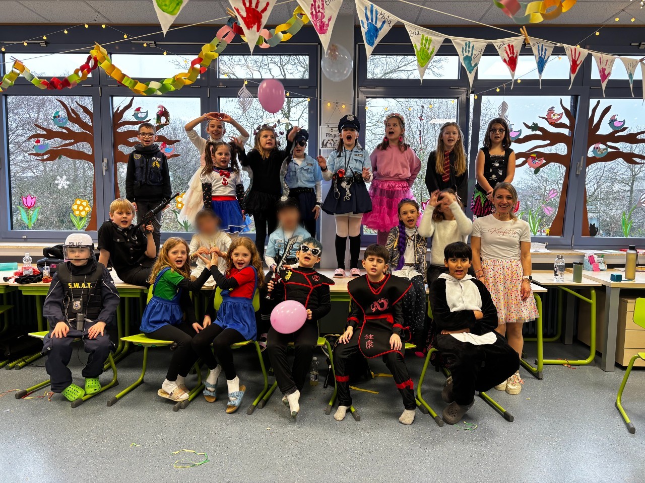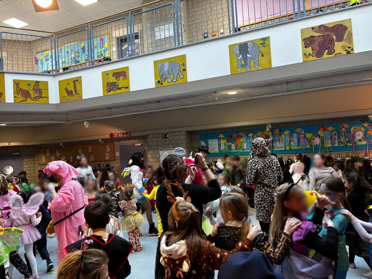 Schon früh am Morgen bevölkerten wilde Tiere, gefährliche Fabelwesen, mutige Ritter und zarte Prinzessinnen das Schulgebäude, um gemeinsam den rheinischen Karneval zu eröffnen. Doch trotz des Trubels blieb alles in bester Ordnung, schließlich sorgten zahlreiche kleine Polizisten und FBI-Agenten für die notwendige Sicherheit im närrischen Treiben.