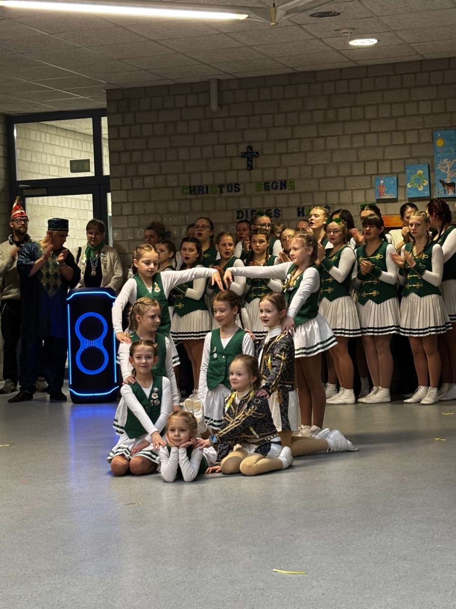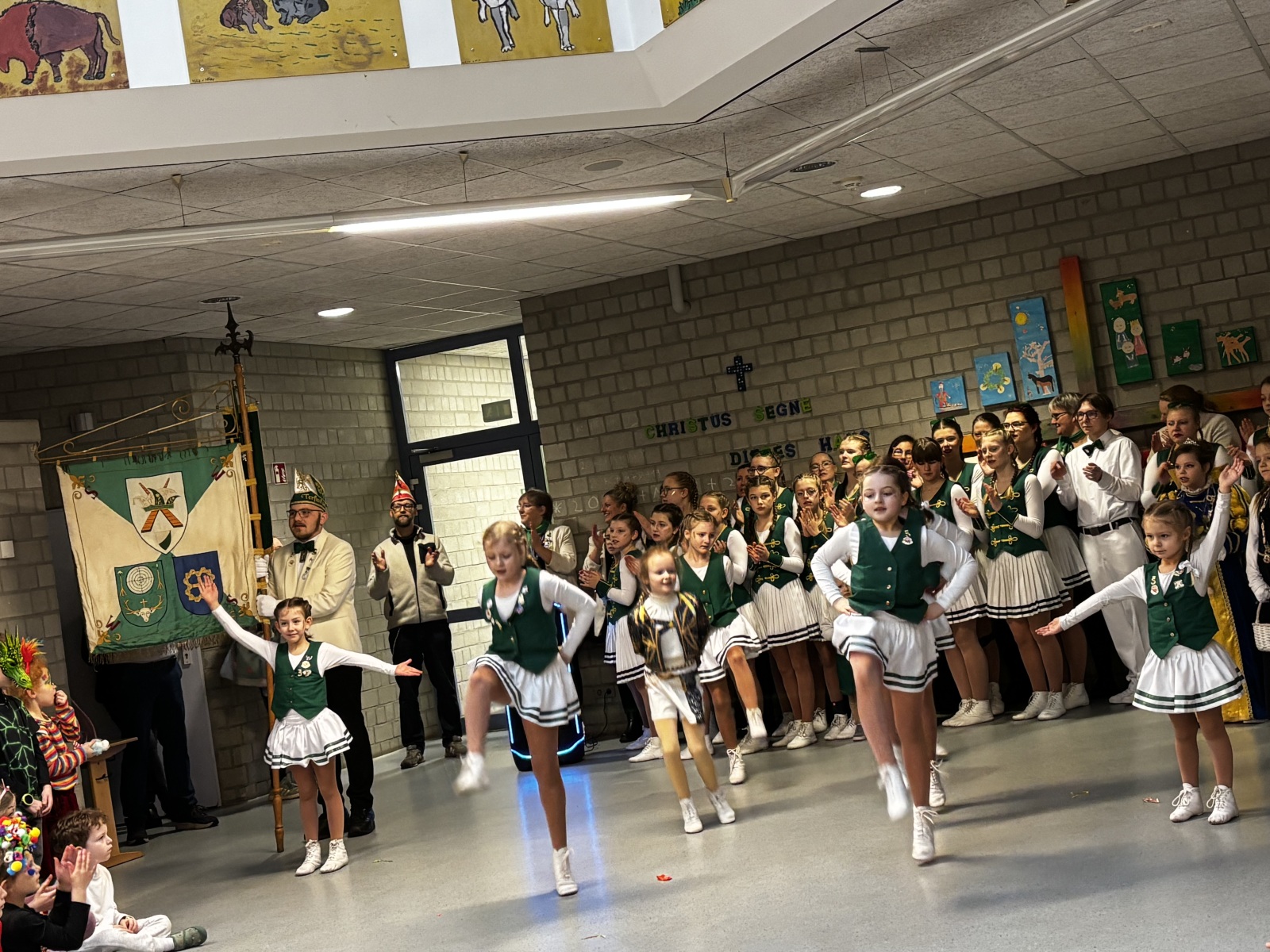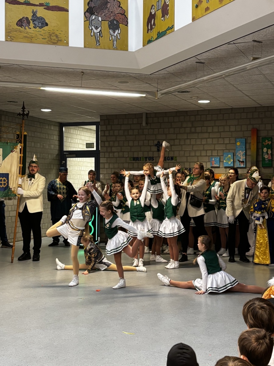 Bereits um 9 Uhr startete die erste große Polonaise durch das Schulgebäude. Gut gelaunt zogen die Kinder und Lehrerinnen durch die bunt geschmückten Klassenräume, bis sich alle im Forum versammelten. Dort hieß die Schule die KG Torfmöps 68 Schiefbahn willkommen, die mit einem schwungvollen Auftritt der Minijiskes für Begeisterung sorgte.